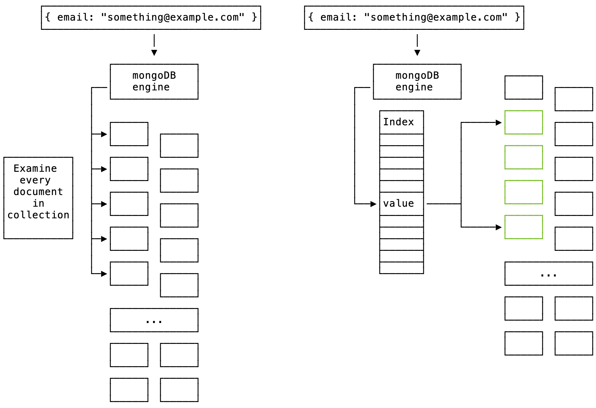 An index in action. Without an index, MongoDB must examine every document in order to fulfill a query. With an index, however, it can very quickly narrow down what it’s looking for.